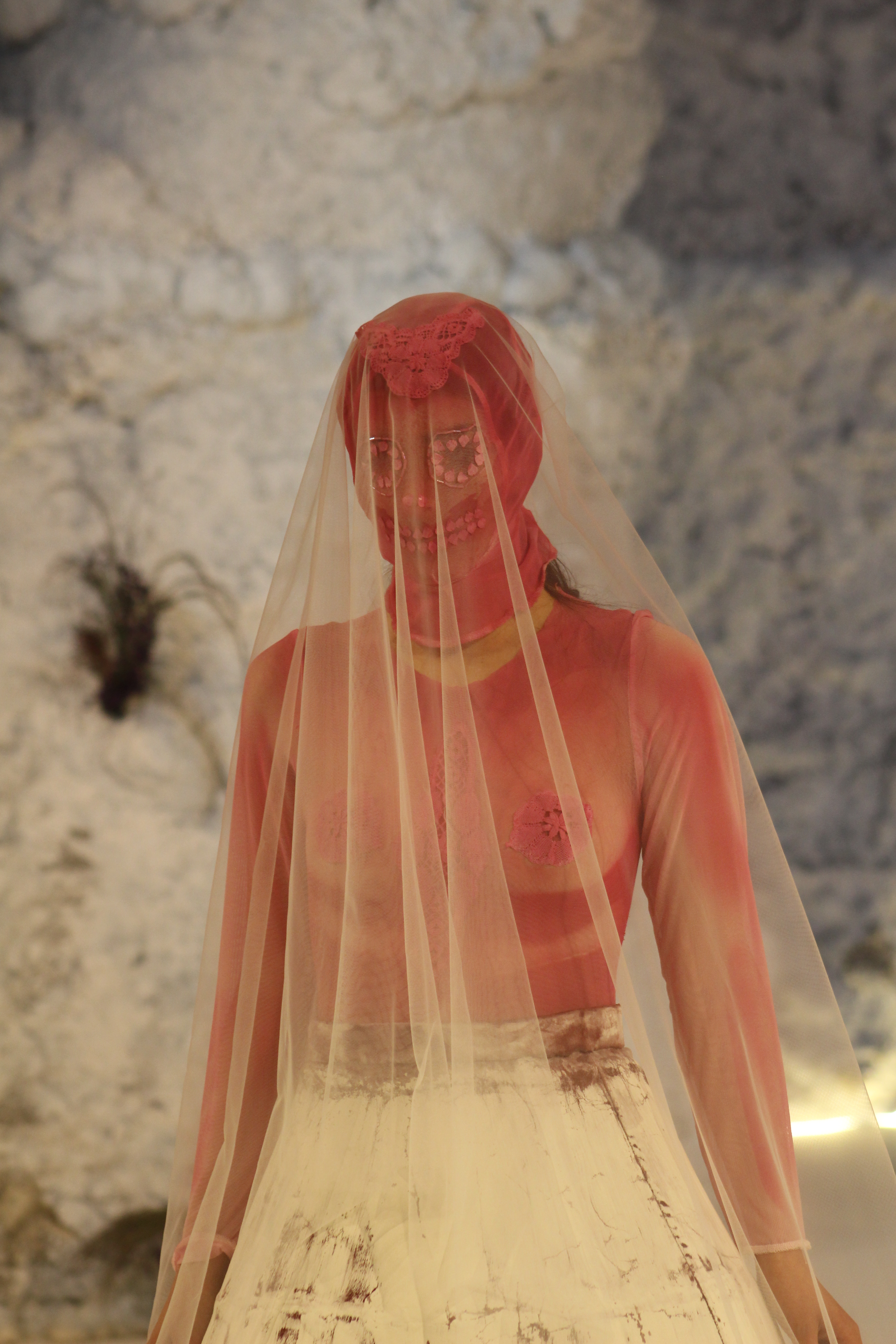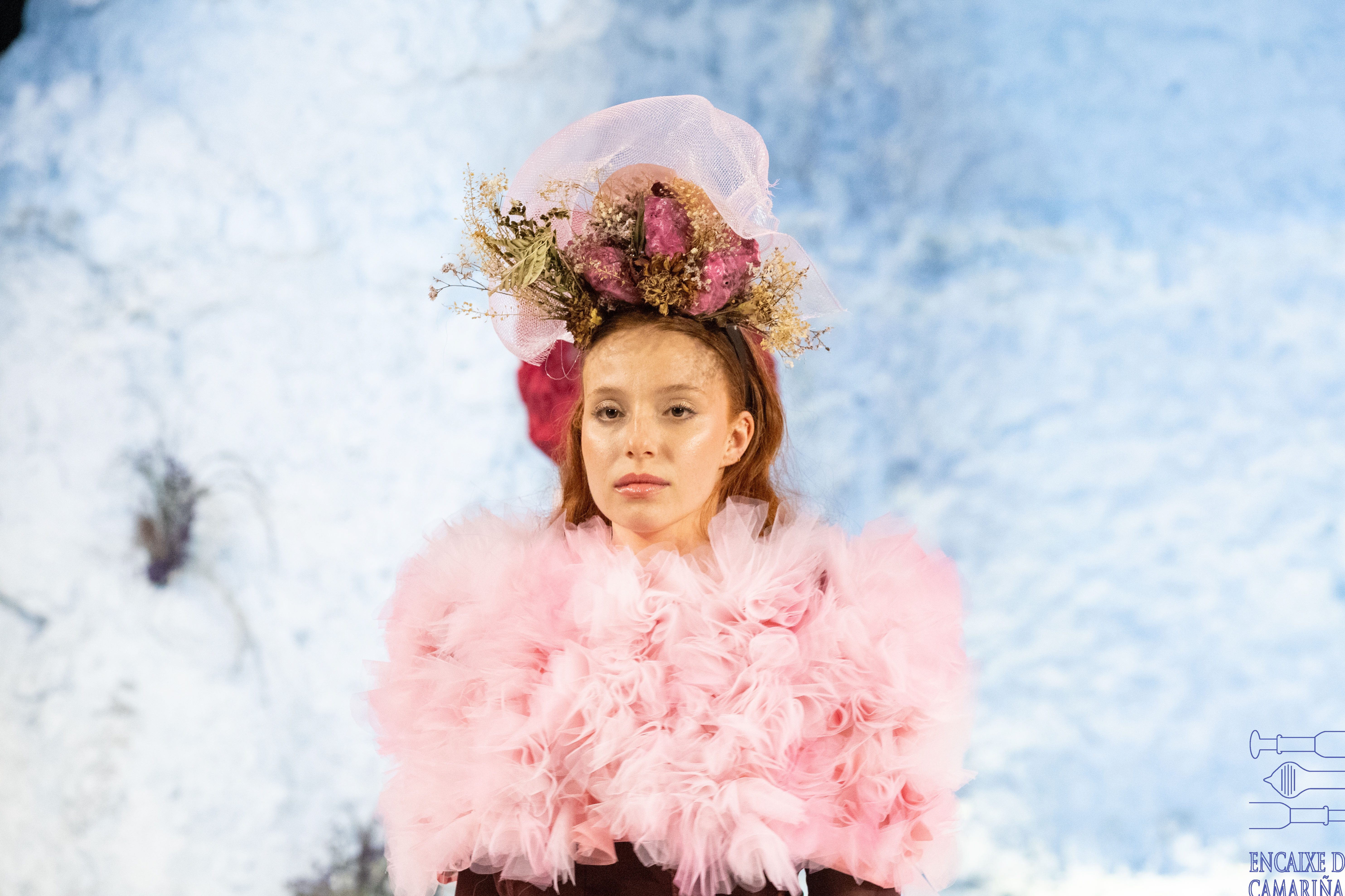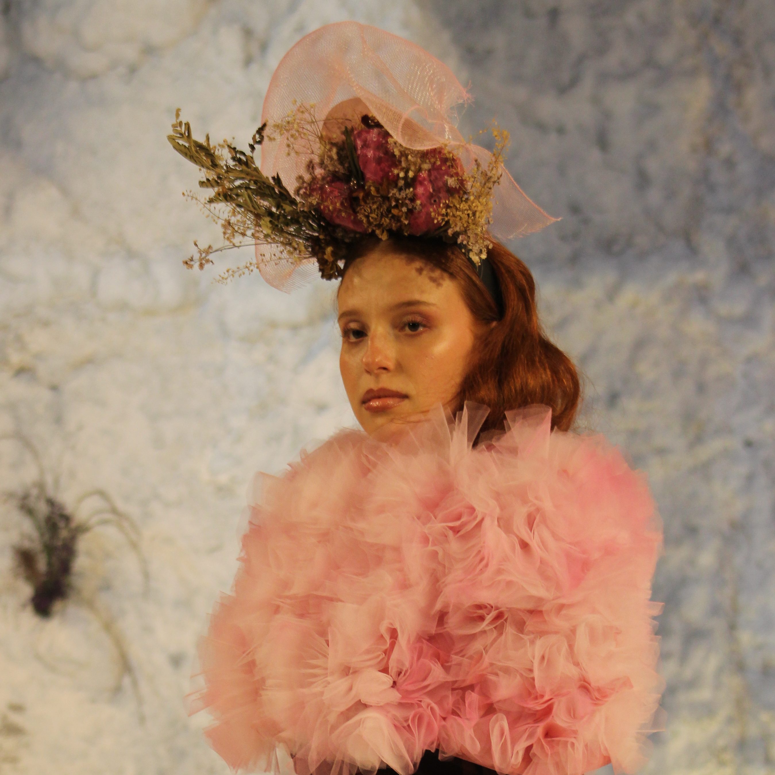 These pieces accompany the collection as sculptural forms in their own right. Handcrafted from dried flowers, lace, tulle, and ornamental elements, they become floral crowns that interact intimately with the body and the gaze.